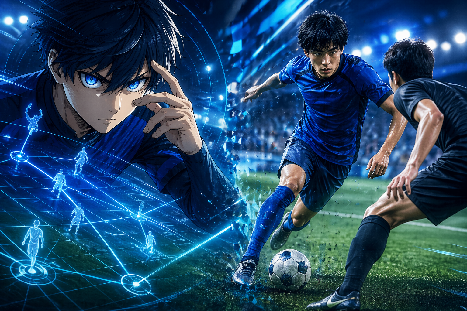 潔世一のメタ・ビジョンをイメージした青い視線とサッカー選手の疾走シーン